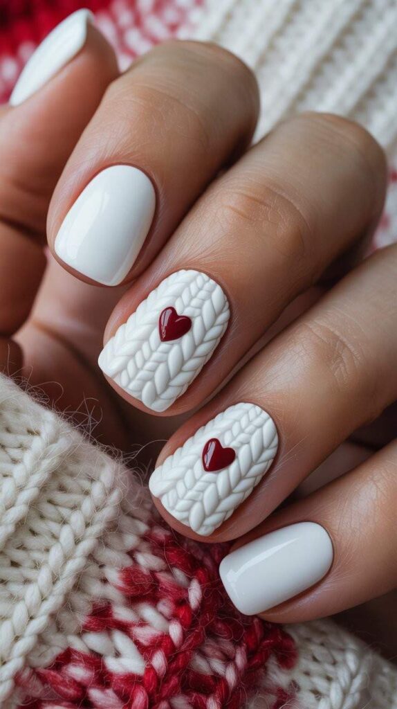 Clean white nails feature a textured knit pattern, with two accent nails showcasing tiny red hearts nestled in the weave — like a cozy winter sweater come to life. The glossy finish gives it a modern, edgy vibe — perfect for night owls or starry-eyed dreamers.
