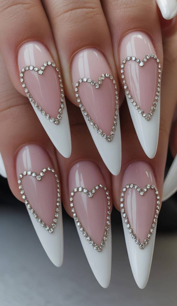 Soft blush pink meets crisp white tips, but here’s the twist: each nail features a heart outline paved with micro-rhinestones — like a miniature tiara for your fingertips. The glossy finish makes it pop — elegant, romantic, and perfect for evening receptions.