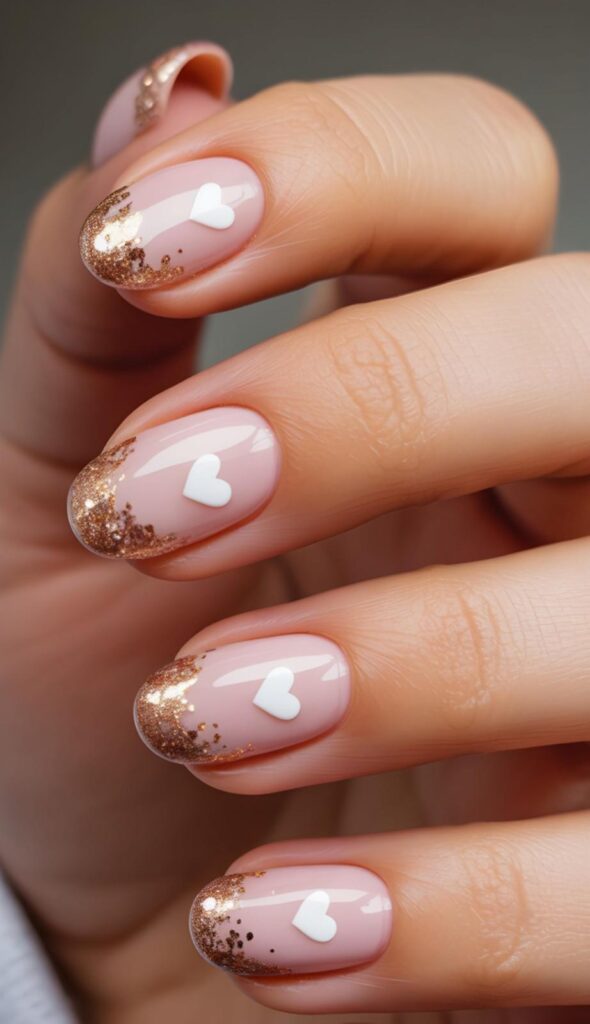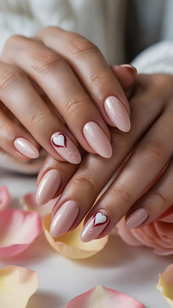 Soft nude polish meets crisp white hearts scattered across each nail — like a love letter written in dots. The glossy finish catches every glint of light, making it perfect for Valentine’s dates or cozy nights in. Simple, sweet, and totally wearable.