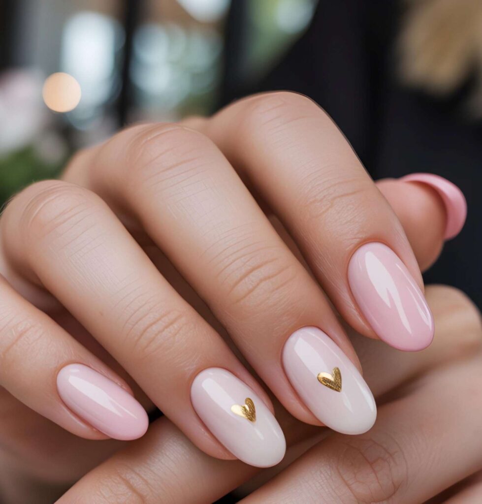 Clean white nails meet soft nude bases, with two accent nails featuring tiny gold hearts — modern, chic, and perfect for showing off your engagement ring. The matte-to-glossy gradient adds depth, while the minimalist base lets the design shine.