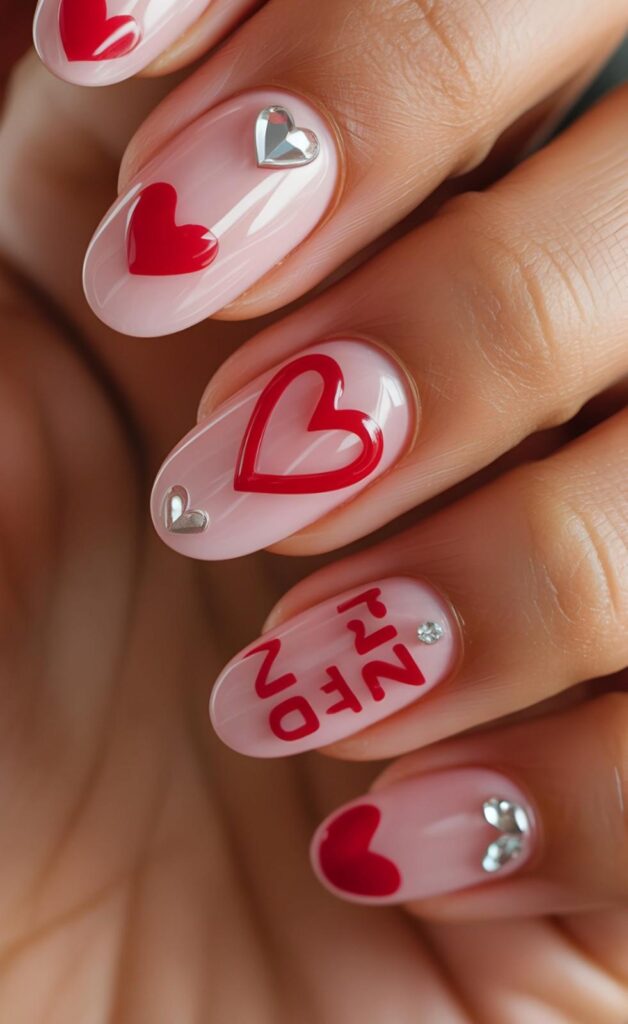 Soft blush pink nails are adorned with bold red hearts and one accent nail featuring ‘2026’ in playful script — a sweet nod to the year of love. Tiny rhinestones add just enough sparkle to make it feel special without going overboard. The glossy finish makes it pop — perfect for couples celebrating their first Valentine’s together. Perfect For: New couples, anniversary celebrations, or anyone who wants to mark the year with a touch of romance.