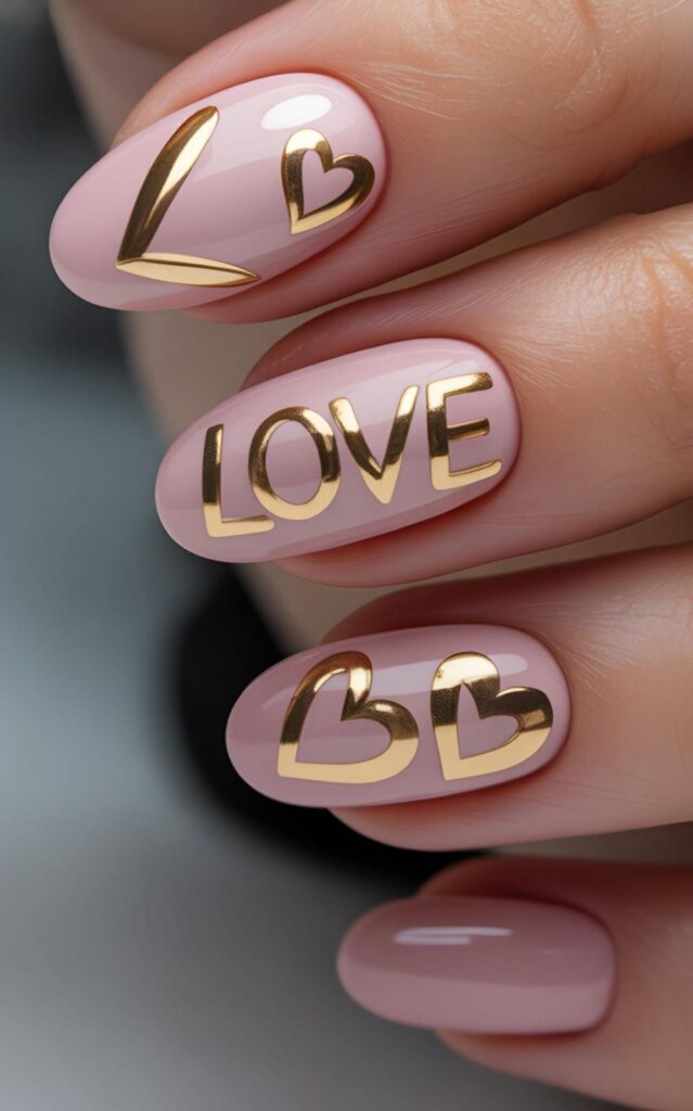 Soft blush pink nails are adorned with bold gold lettering spelling ‘LOVE’ on one accent nail, while others feature sculpted gold hearts — playful, romantic, and perfect for showing off your engagement ring. The glossy finish catches every glint of light, making it ideal for photos, vows, and first dances.