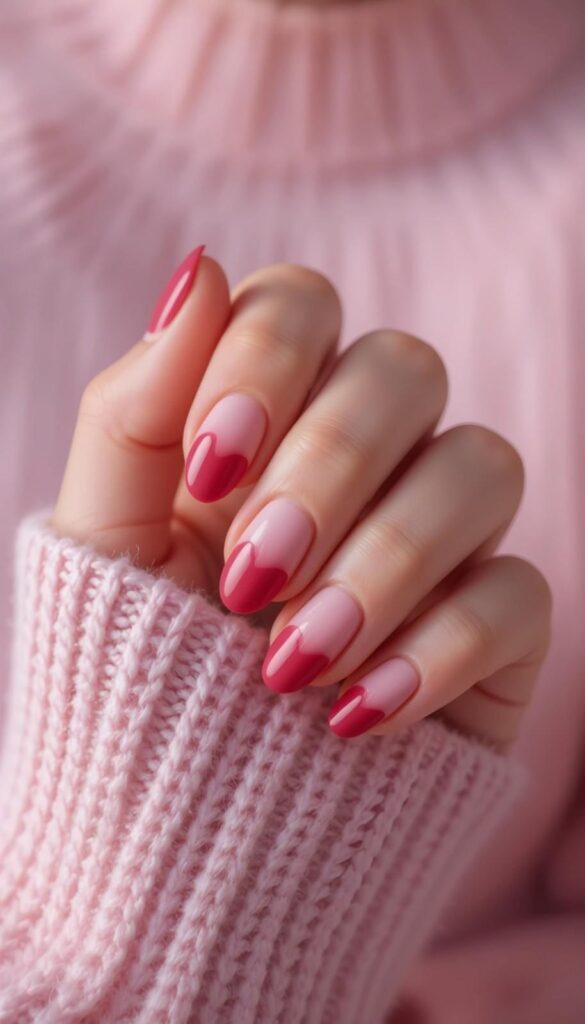 Soft blush pink fades into bold berry red at the tips — like a love letter written in color. The glossy finish catches every glint of light, making it perfect for candlelit dinners or surprise proposals. Paired with a cozy pink knit sweater, this design whispers ‘romance’ with every gesture — simple, elegant, and totally wearable.