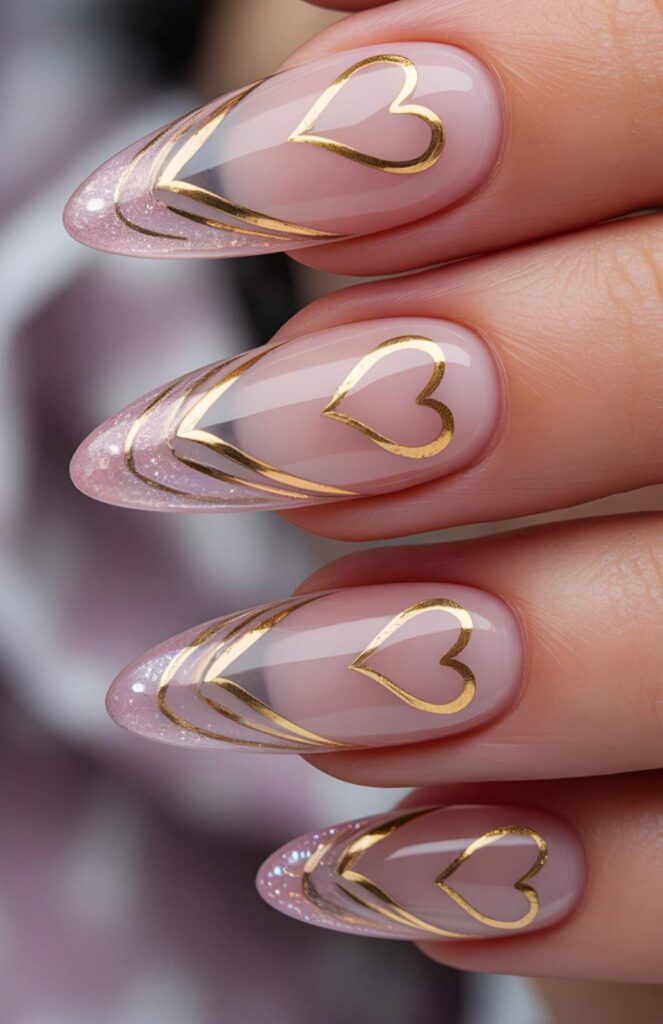 Soft pink polish meets shimmering glitter at the tips, with each nail featuring a delicate gold heart outline — modern, chic, and perfect for showing off your engagement ring. The glossy finish makes it pop without overpowering your look, while the sharp stiletto shape elongates the fingers.