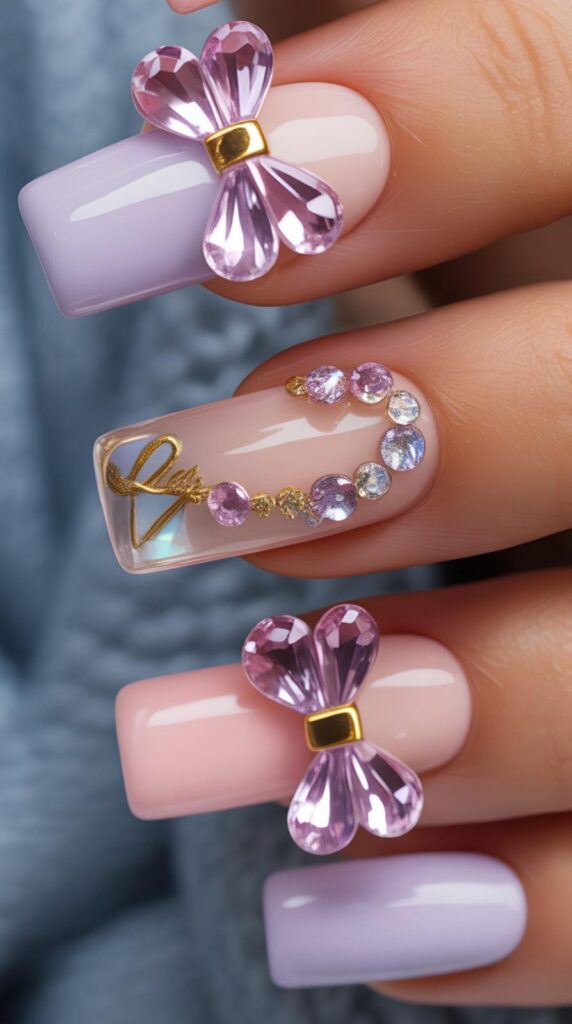 Soft lavender and blush pink nails are adorned with oversized amethyst bow charms and scattered rhinestones — like a luxury gift box come to life. The glossy finish catches every glint of light, making it perfect for Valentine’s dates or Galentine’s brunches. The gold ribbon detail adds a touch of opulence.