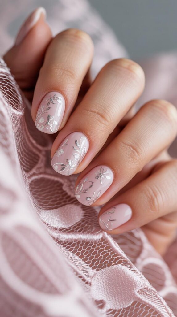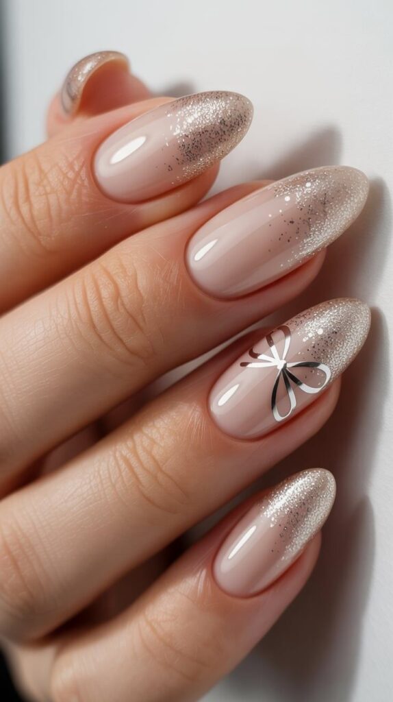 “Sheer nude base meets silver glitter at the tips, with one nail featuring a minimalist silver bow painted in fine lines. It’s modern, elegant, and pairs beautifully with sleek silhouettes or lace gowns.”