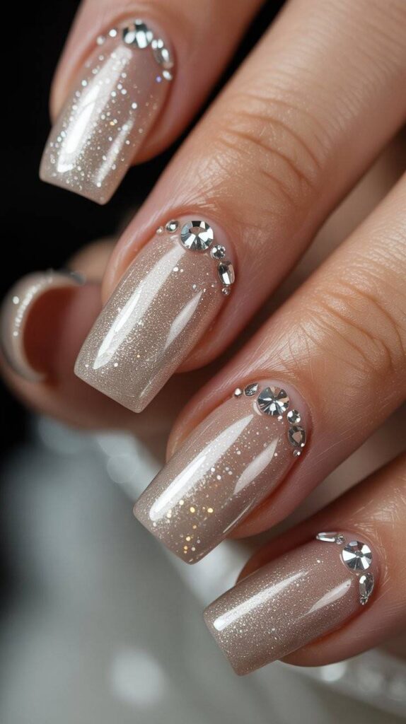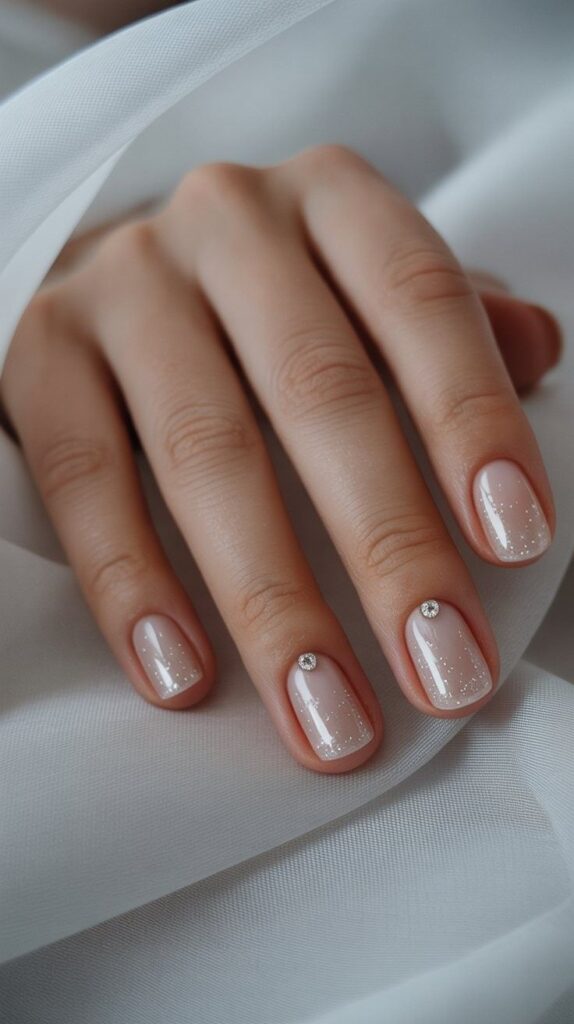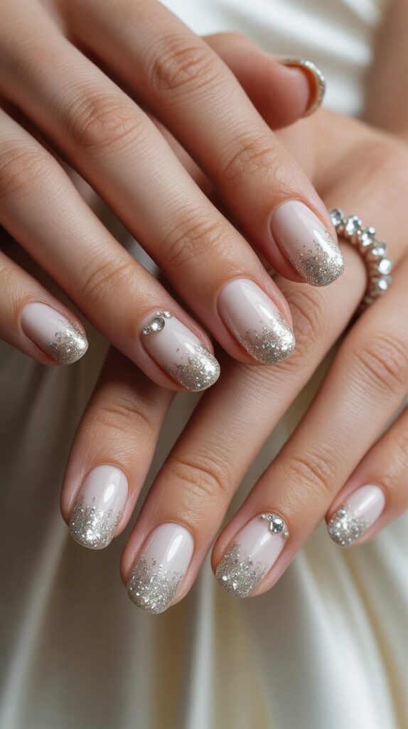 “Nude polish meets silver glitter in a soft gradient, with one nail featuring a single rhinestone nestled in a crescent of shimmer. It’s understated but unforgettable — perfect for brides who want elegance that whispers, not shouts.”