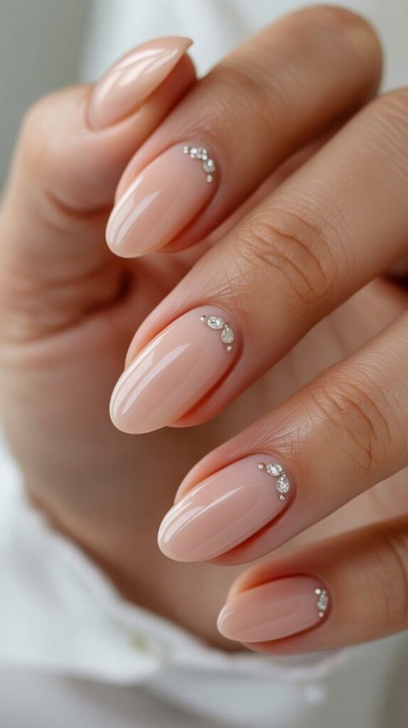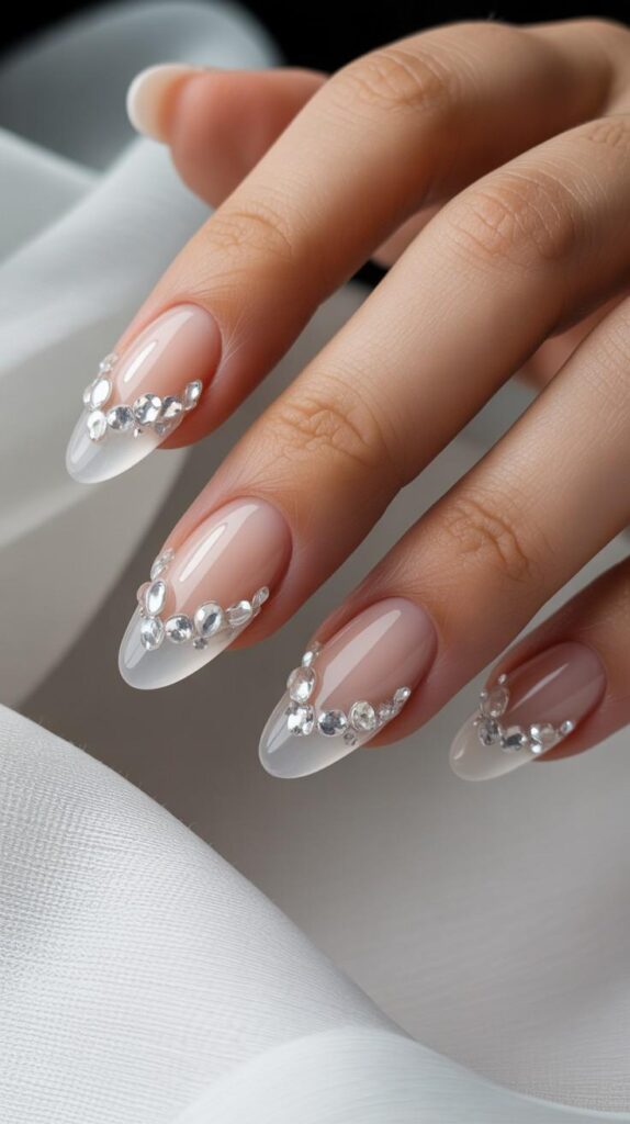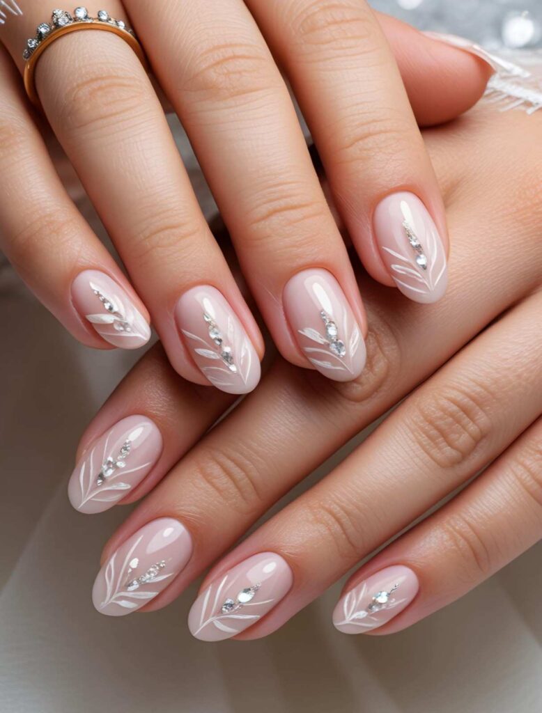 “Nude polish frames each nail with a whisper of silver rhinestones arranged in a delicate crescent shape — like a tiny moonbeam catching the light. It’s understated but unforgettable — ideal for brides who believe less is more… but more beautiful.”
