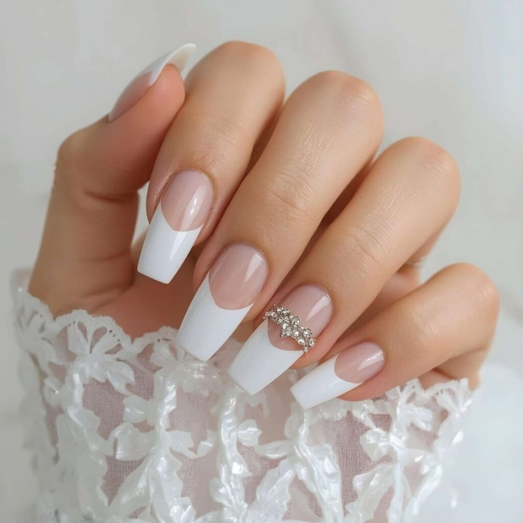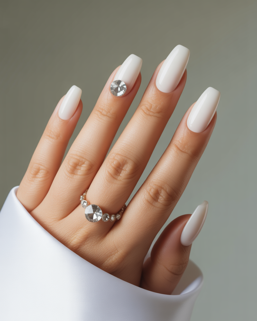 “Pure white almond nails gleam with high-gloss polish, while one accent nail features a single oversized crystal nestled near the cuticle — like a miniature tiara for your fingertips. The look is clean, regal, and made for close-ups — perfect for photos, vows, and first dances.