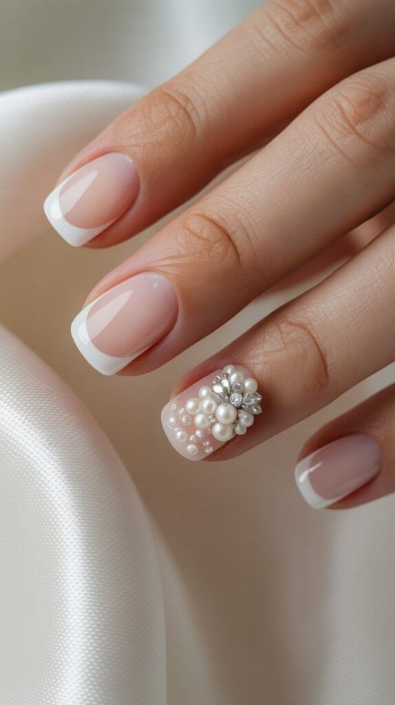 “Clean white tips meet soft blush pink bases, but here’s the twist: scattered pearls cascade across each nail like morning dew on petals. The matte-to-glossy gradient adds depth, while the minimalist base lets the pearls shine — ideal for brides who believe less is more… but more beautiful.