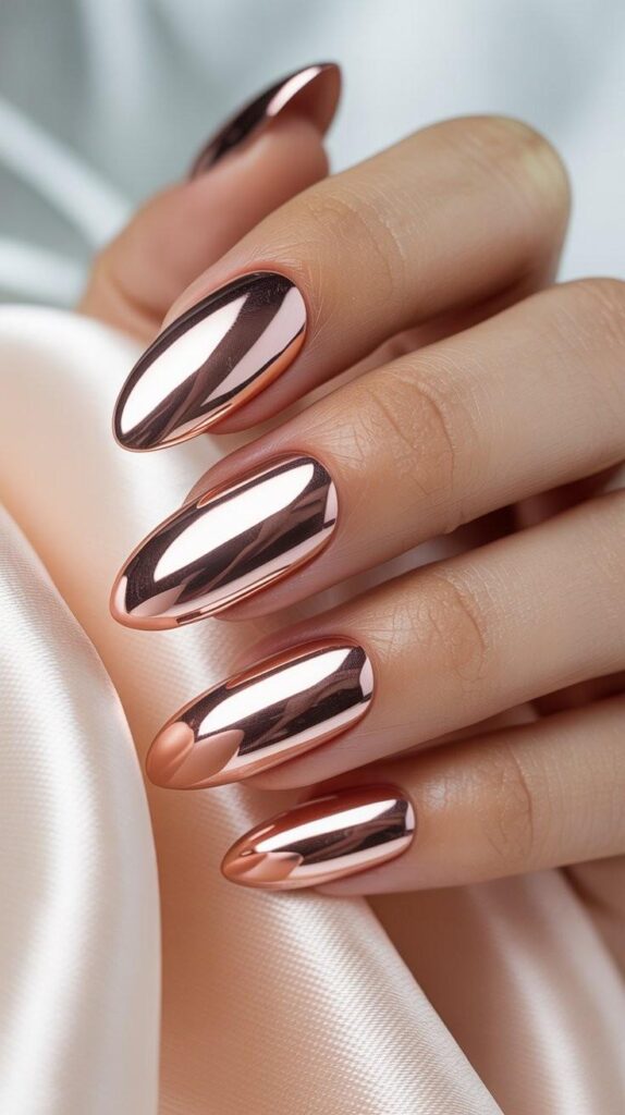 “High-shine rose gold chrome covers every nail — sleek, modern, and undeniably luxe. The reflective finish catches every glint of light, making it perfect for evening receptions under twinkling chandeliers.”