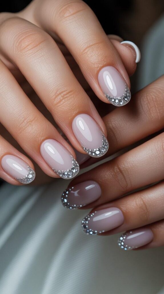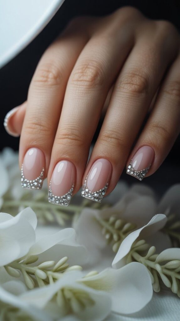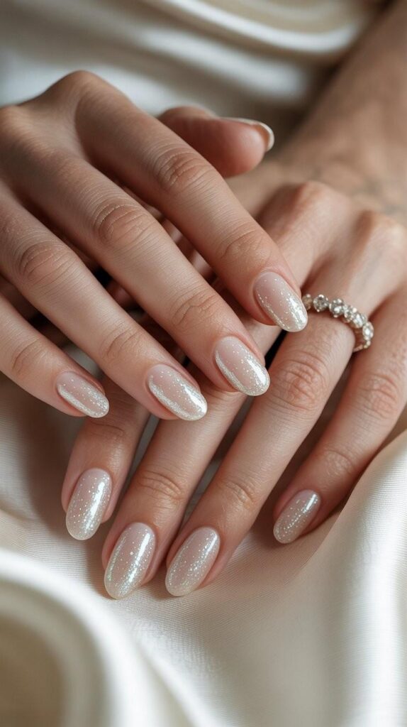 “Nude polish meets silver glitter in a soft half-moon shape, with scattered micro-rhinestones adding texture and sparkle. It’s understated but unforgettable — ideal for brides who want elegance that whispers, not shouts.”