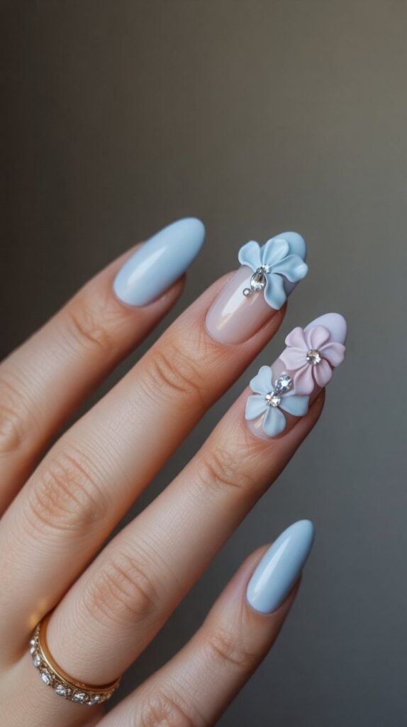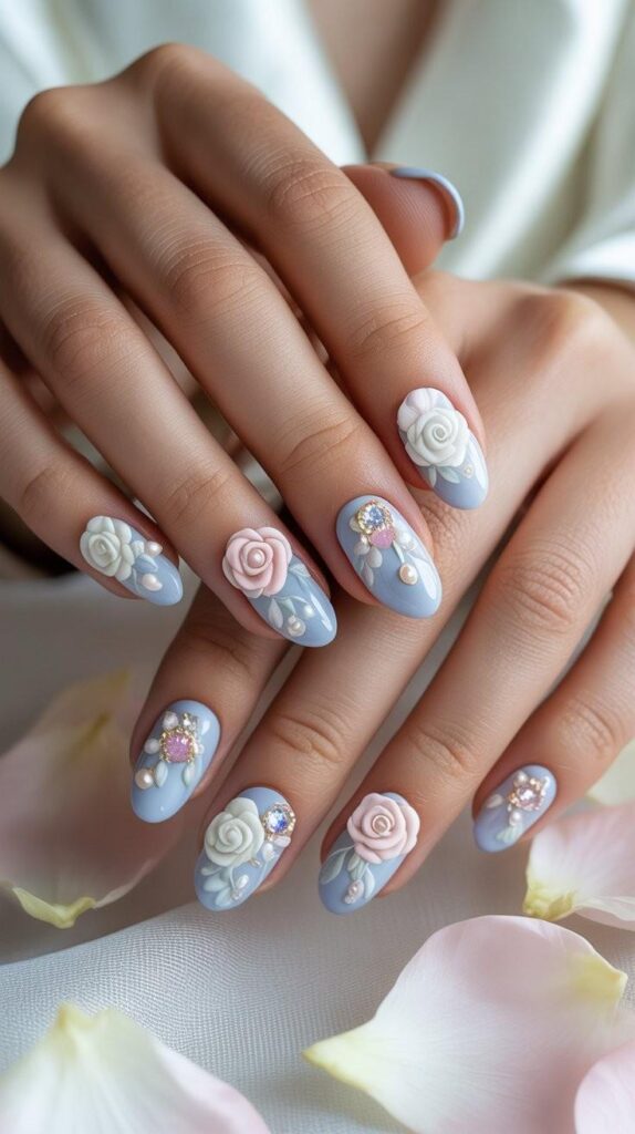 “Soft baby blue and blush pink nails bloom with sculpted 3D flowers, each accented with tiny rhinestones like dewdrops at dawn. Delicate green leaves and shimmering details make this design feel like a garden wedding captured in miniature.”