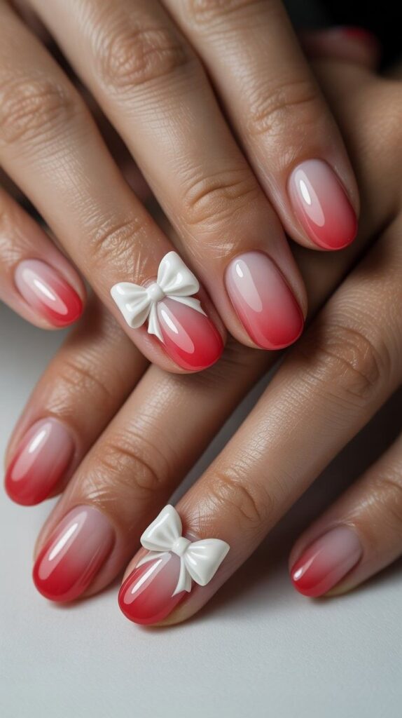 “Soft pink fades into bold coral at the tips, with two accent nails featuring sculpted white bows that look good enough to touch. The glossy finish makes it pop — playful, romantic, and perfect for brides who love a little sweetness.”