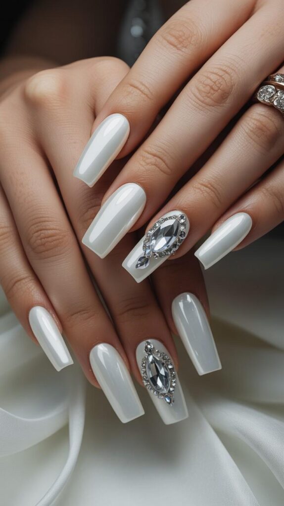 “Pure white almond nails gleam with high-gloss polish, while two accent nails feature oversized marquise-cut crystals framed in delicate silver filigree — like miniature tiaras for your fingertips. The look is clean, regal, and made for close-ups.”