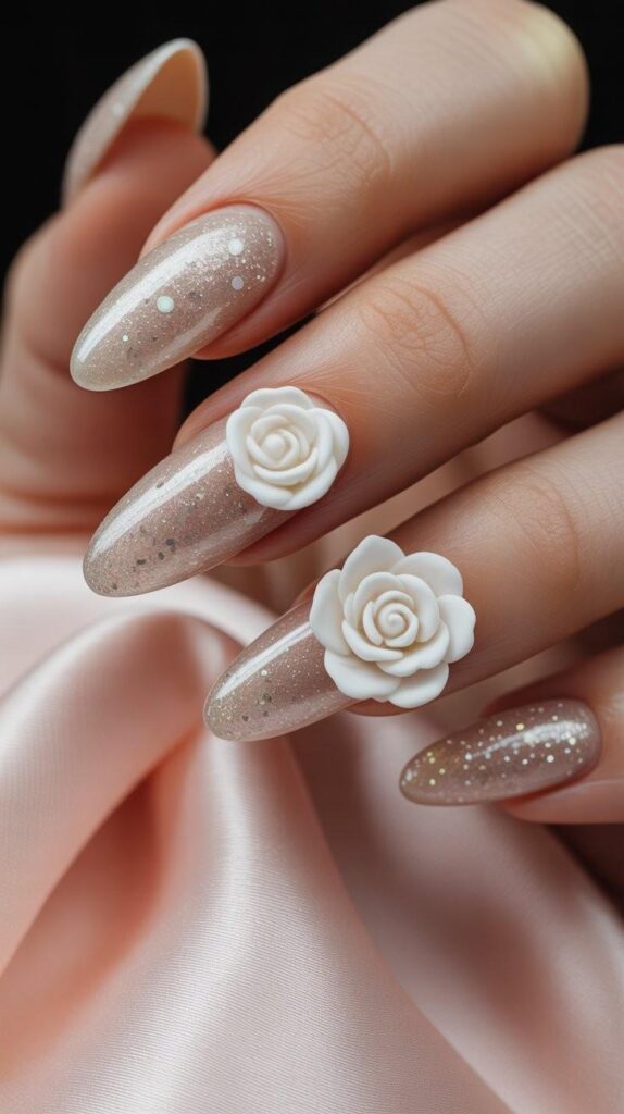 “A champagne glitter ombre fades into sheer nude at the base, while two accent nails feature sculpted white roses that look good enough to touch. The finish is glossy and romantic — like a garden wedding captured in miniature.”