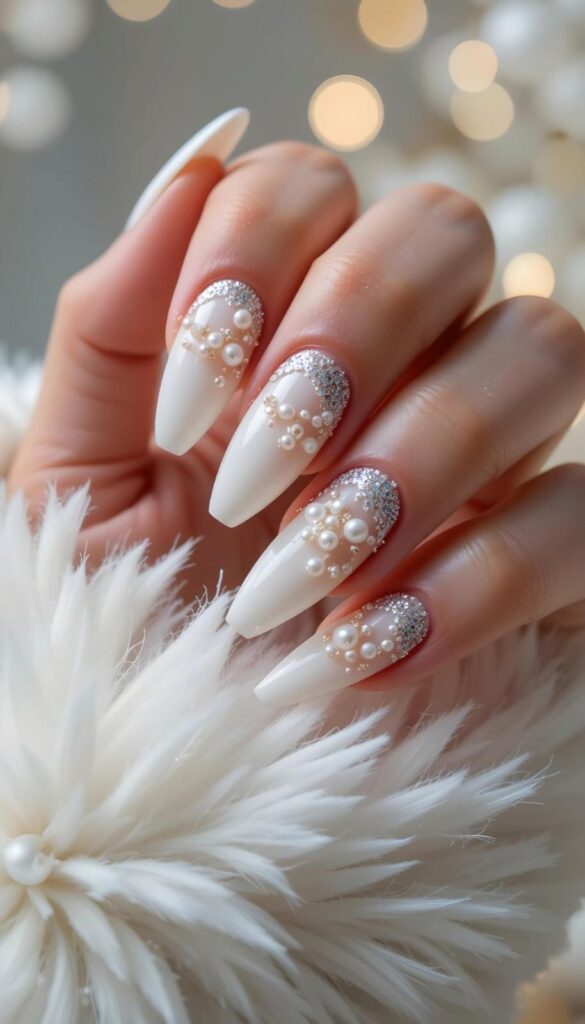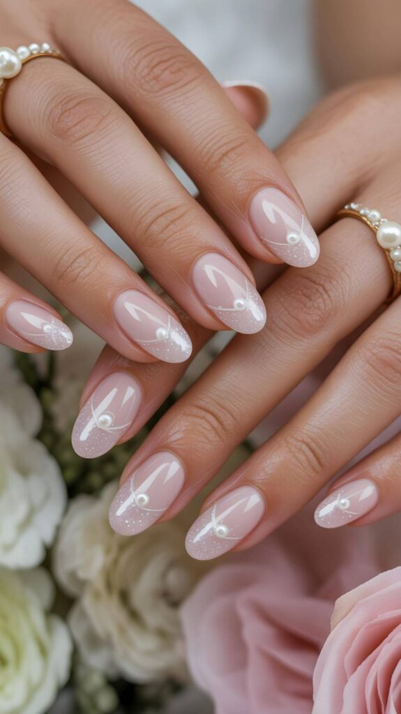 “Ivory almond-shaped nails are adorned with cascading pearls and silver glitter ombre, creating a look that’s equal parts romantic and refined. The soft pink base adds warmth — ideal for brides who want to feel like a dream.”
