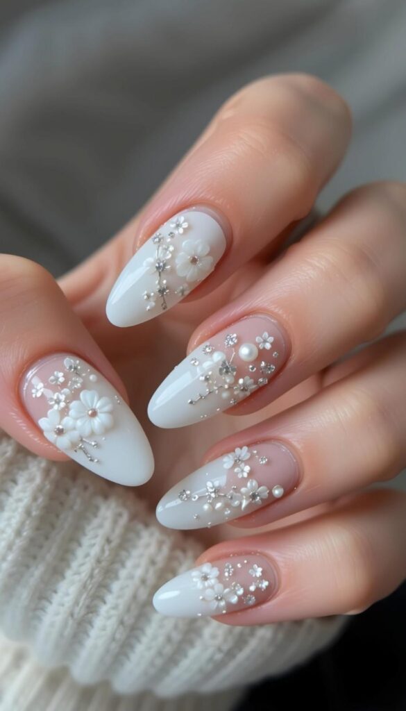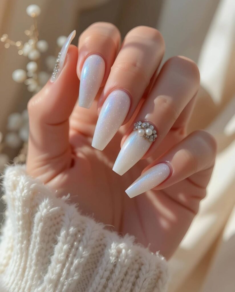 “A milky white base shimmers with opalescent glitter, while one nail steals the show with a cluster of pearls and crystals arranged like a bridal brooch. The long, almond shape elongates the fingers — perfect for holding bouquets or showing off your ring.”