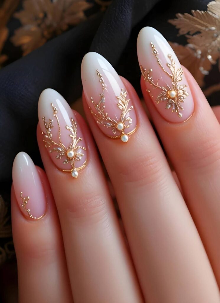 “White almond-shaped nails are adorned with hand-painted floral vines and scattered pearls, creating a look that’s equal parts romantic and refined. The soft pink base adds warmth — ideal for brides who want to feel like a dream.”