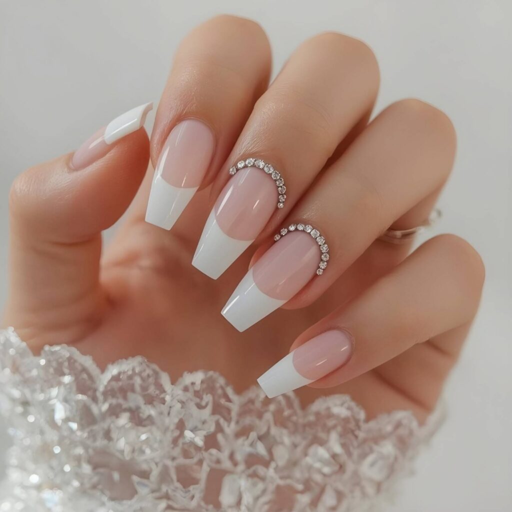 “Classic French tips get a luxury upgrade with a half-moon band of micro-rhinestones tracing the smile line. Paired with soft pink bases and crisp white tips, it’s the definition of ‘bridal chic’ — clean, refined, and camera-ready.”