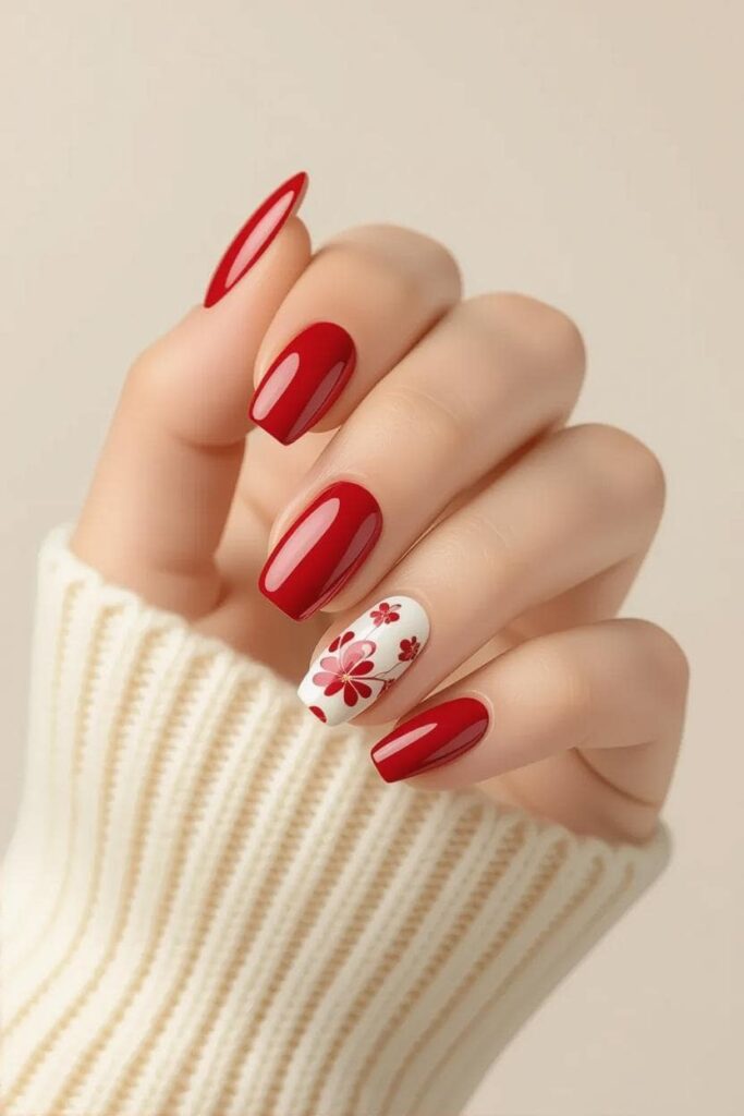 A rich red glossy base frames one accent nail featuring a simple red flower bloom with black outlines on a white background β clean, sweet, and full of autumn energy. The look is elegant without being overwhelming, perfect for those who love subtle floral charm with a touch of drama.