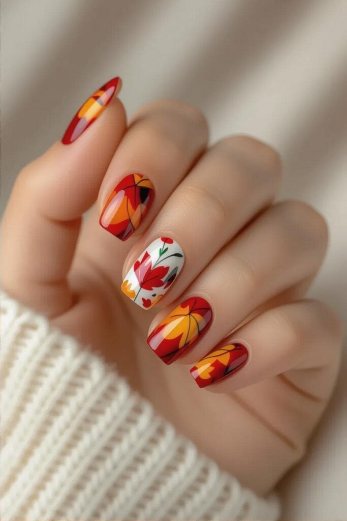 A clean cream glossy base lets two accent nails shine β one featuring vibrant orange maple leaves on a yellow background, the other showcasing red and orange leaves on white. The look is sweet, playful, and full of seasonal joy β like wearing a fall wreath on your fingertips.