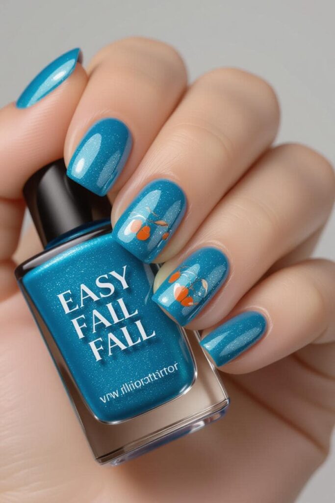 A rich teal glitter base glows with fine silver sparkle, while two accent nails feature delicate orange cherry decals with gold stems β playful, modern, and full of autumn whimsy. The look is bold without being busy, perfect for those who love unexpected color with a touch of sweetness.