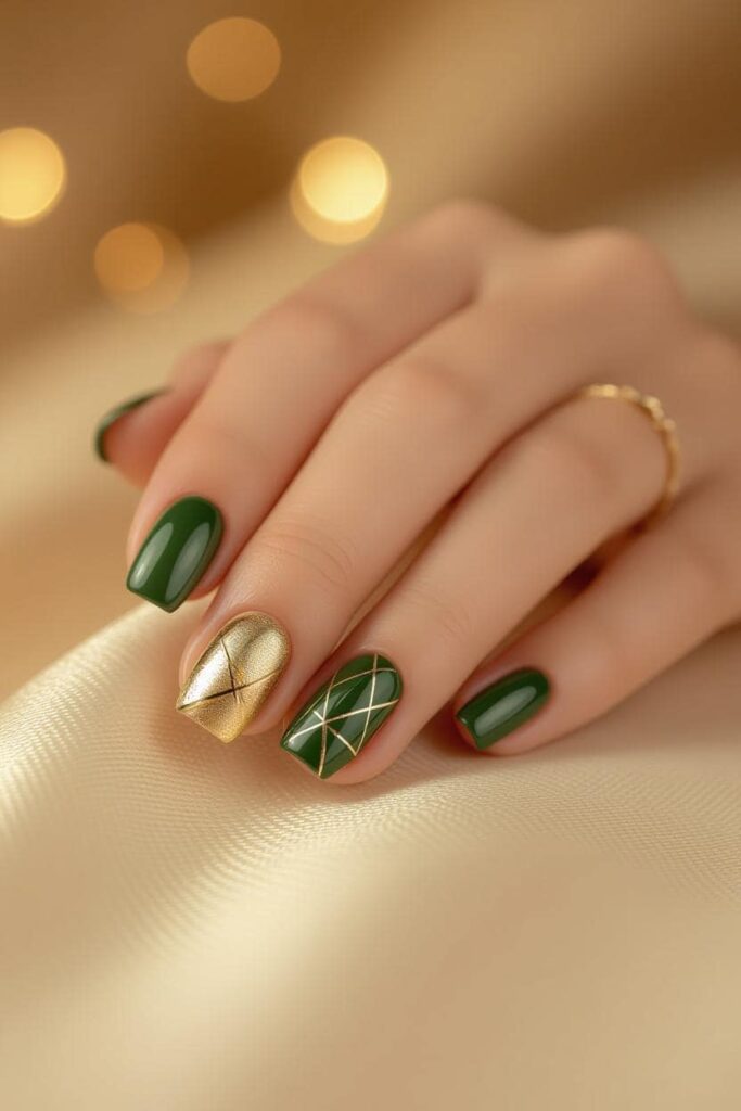 A deep green glossy base frames two accent nails β one in shimmering gold chrome, the other featuring delicate gold geometric lines. The look is modern, earthy, and full of quiet luxury β perfect for those who love minimalist elegance with a touch of sparkle.