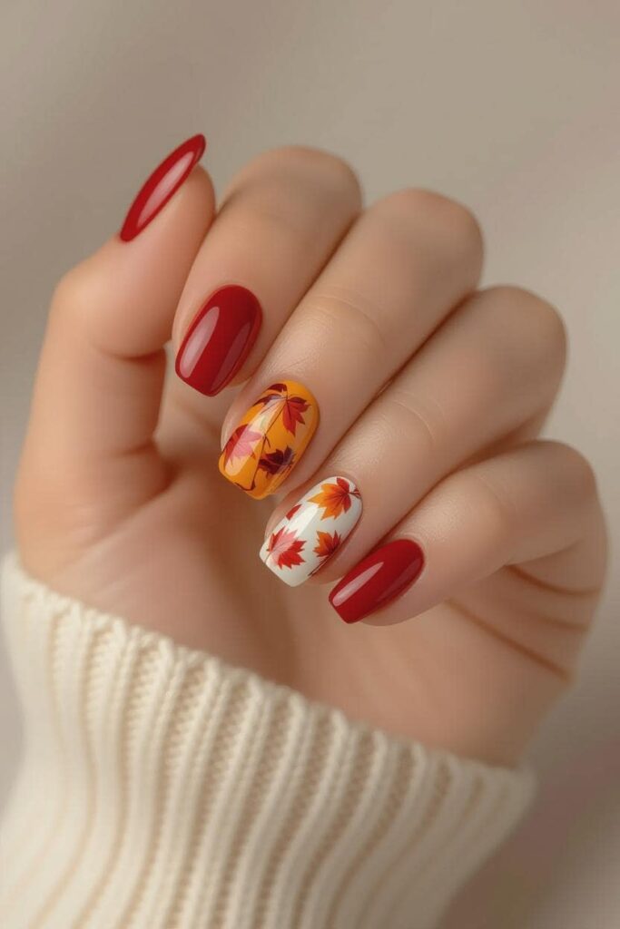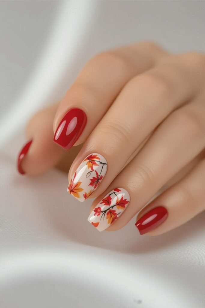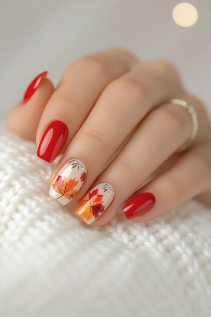 A bold red glossy base frames two accent nails featuring delicate watercolor-style maple leaves in warm orange and gold tones β one on white, the other on cream. The look is playful, artistic, and full of autumn joy β perfect for those who love color without clutter.