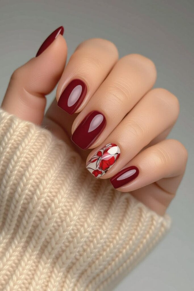 A velvety burgundy glossy base lets two accent nails steal the show β featuring simple red flower blooms with black outlines on a white background. The look is sweet, romantic, and full of quiet elegance β like wearing a garden-inspired sweater on your nails.