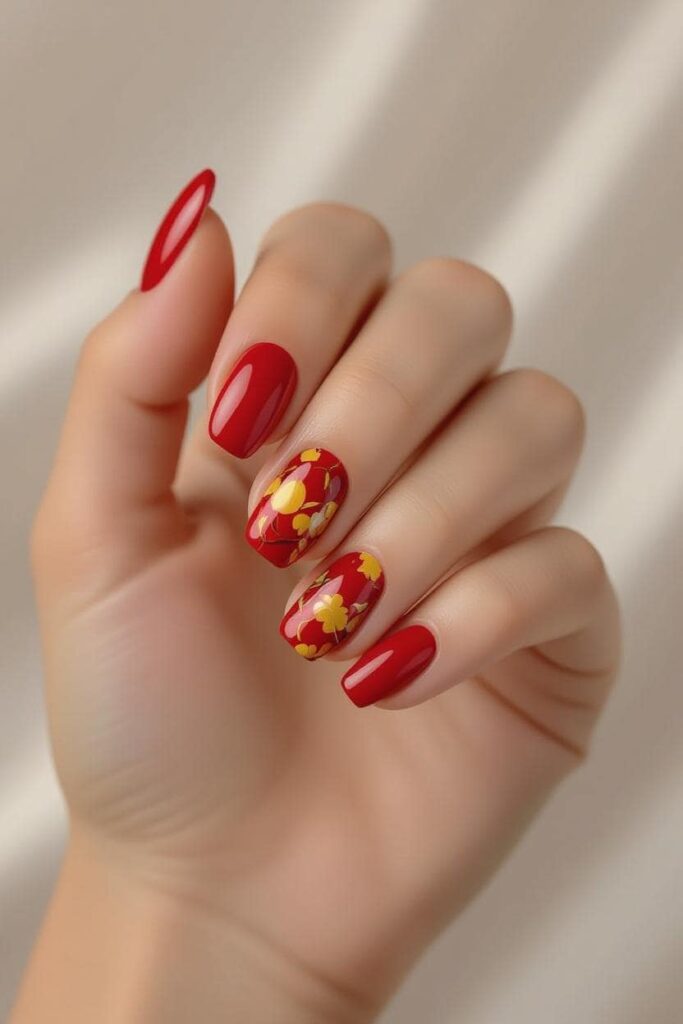 A glossy red base frames two accent nails featuring cheerful yellow flower blooms with green stems β playful, romantic, and full of seasonal joy. The look is sweet without being cutesy, perfect for those who love color with a touch of whimsy.