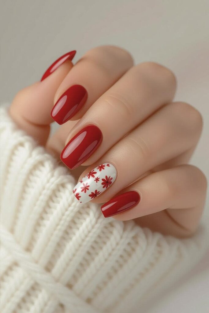 A bold red glossy base frames two accent nails featuring simple white flower blooms with black outlines β clean, sweet, and full of autumn romance. The look is elegant without being overwhelming, perfect for those who love subtle floral charm with a touch of drama.