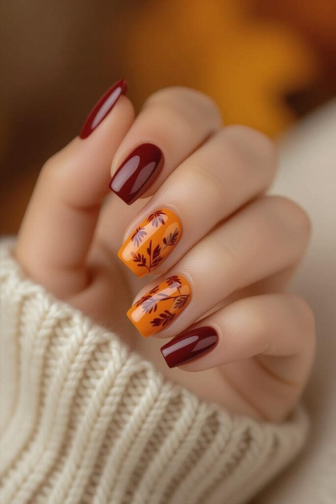 A deep red glossy base frames two accent nails decorated with vibrant orange and yellow maple leaf decals β one on a dark red background, the other on white. The contrast is festive, elegant, and effortless β like wearing a fall wreath on your fingertips.