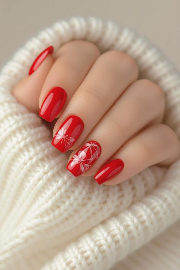 A glossy red base frames one accent nail featuring a simple red flower bloom with black outlines on a white background β clean, sweet, and full of autumn energy. The look is bold without being overwhelming, perfect for those who love festive fun with minimal effort.