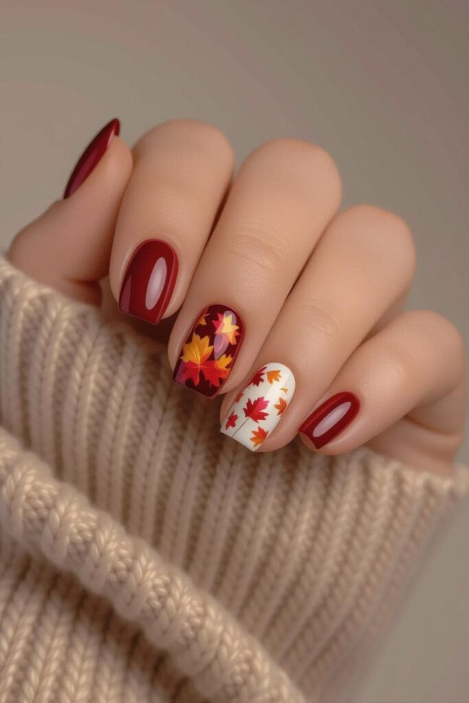A deep red glossy base frames two accent nails featuring abstract watercolor-style maple leaves in warm orange and gold tones β one on white, the other on cream. The look is artistic, playful, and full of autumn joy β perfect for those who love color without clutter.