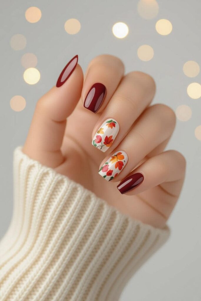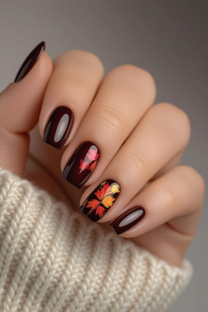 33) Rich Burgundy Base with Watercolor Leaf Accents