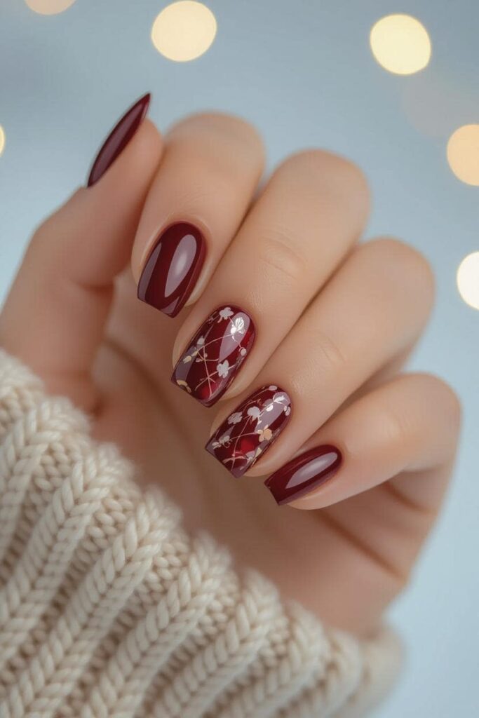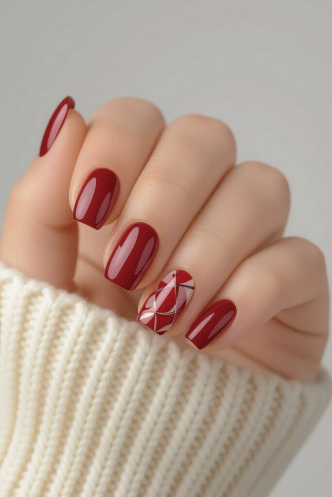 A velvety deep red glossy base frames one accent nail featuring a crisp white diamond grid pattern β modern, minimalist, and full of quiet sophistication. The look is sleek without being boring, perfect for those who love geometric elegance with a touch of drama.