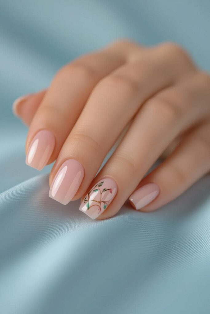 A buttery pink glossy base frames one accent nail featuring a simple vine with tiny green leaves and soft pink buds β clean, romantic, and full of autumn sweetness. The look is feminine without being fussy, perfect for those who love gentle charm with a touch of nature.