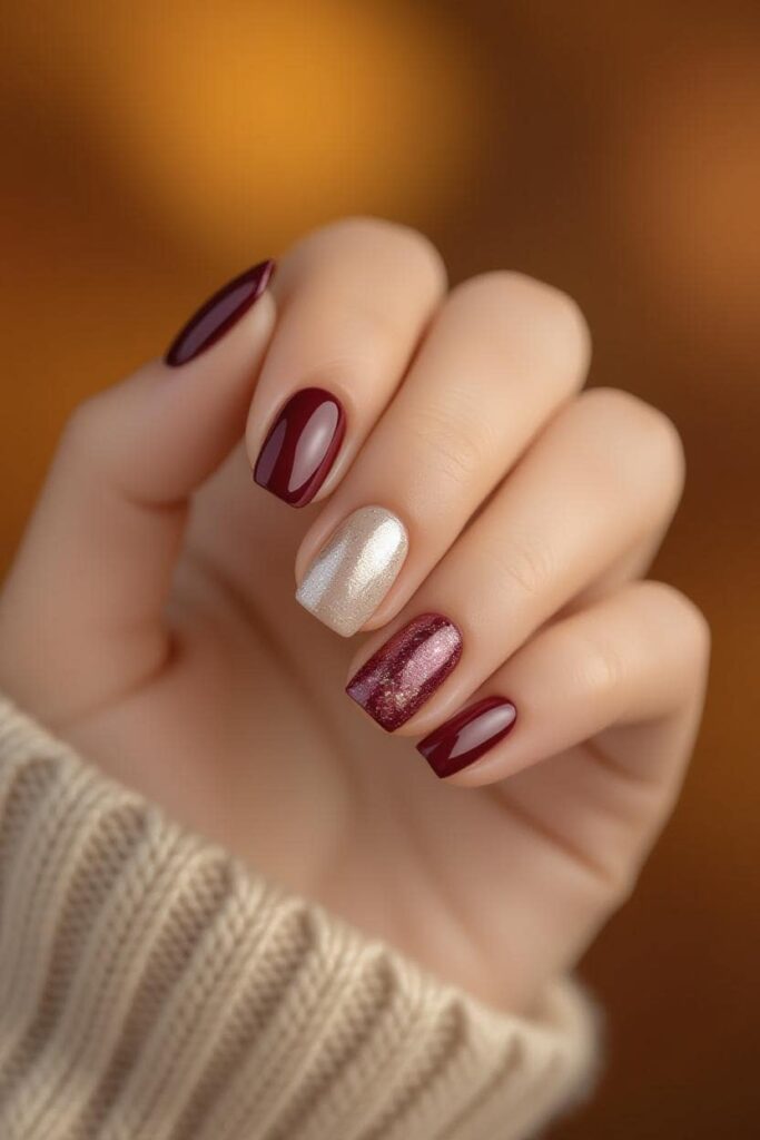 A velvety burgundy glossy base frames two accent nails β one in shimmering silver chrome, the other in sparkling burgundy glitter. The look is glamorous, modern, and full of holiday-ready glow β perfect for those who love subtle sparkle without fuss.