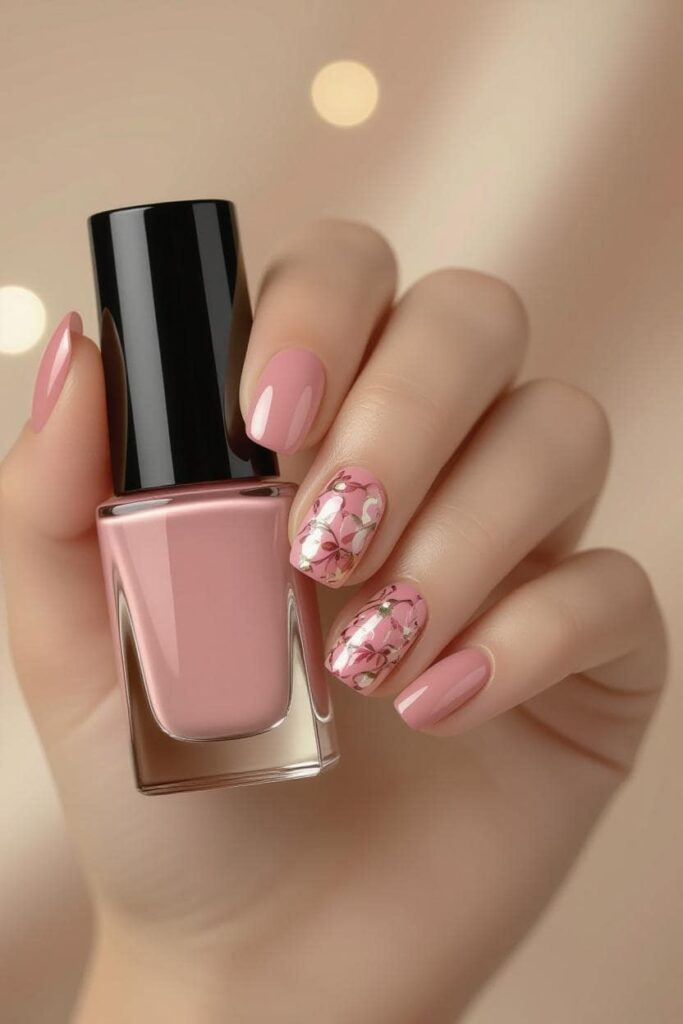 A buttery blush pink glossy base frames two accent nails featuring hand-painted floral blooms in soft pinks and greens β clean, romantic, and full of autumn sweetness. The look is feminine without being fussy, perfect for those who love gentle charm.