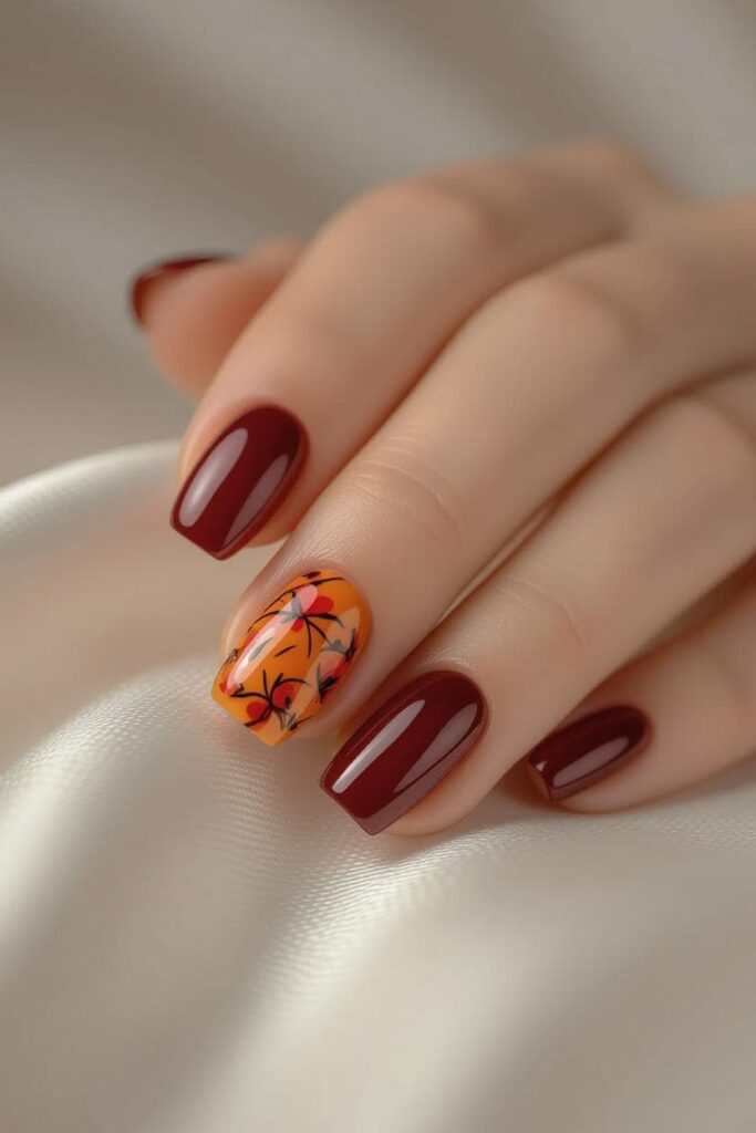 A velvety deep red glossy base frames one accent nail featuring a simple orange flower bloom with black outlines on a yellow background β clean, sweet, and full of autumn energy. The look is bold without being overwhelming, perfect for those who love festive fun with minimal effort.