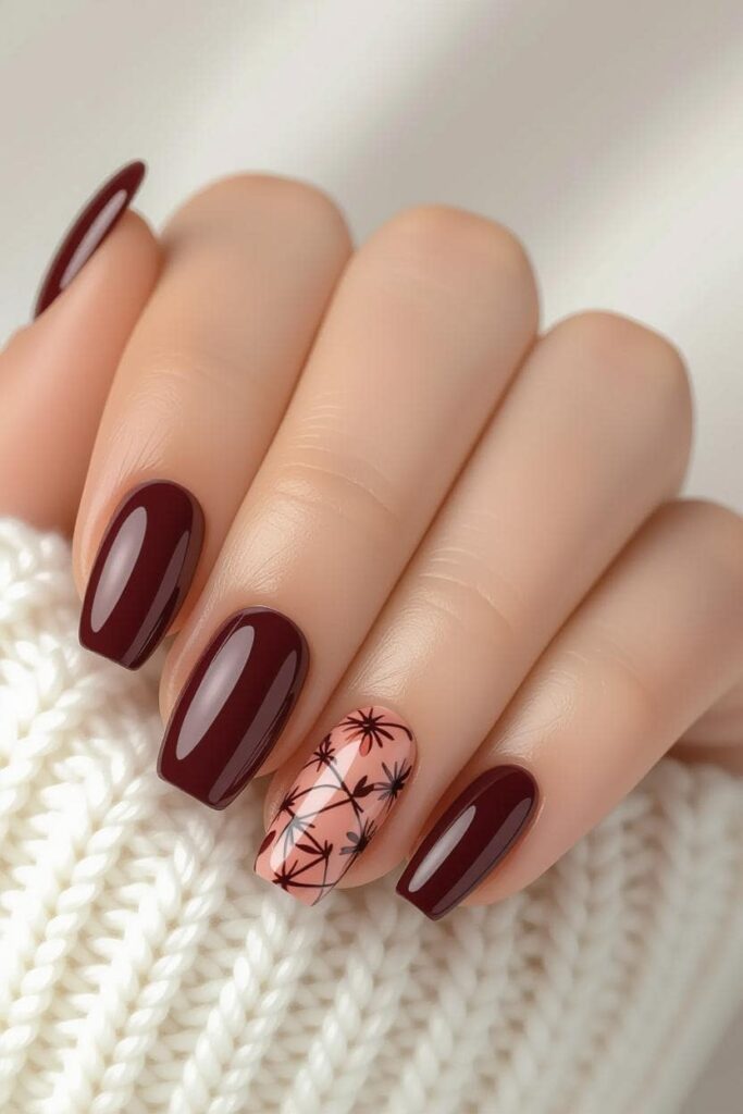 A deep burgundy glossy base frames two accent nails featuring delicate white flower blooms with black outlines β minimalist, dreamy, and full of quiet elegance. The look is modern without being stark, perfect for those who love subtle texture with a touch of romance.