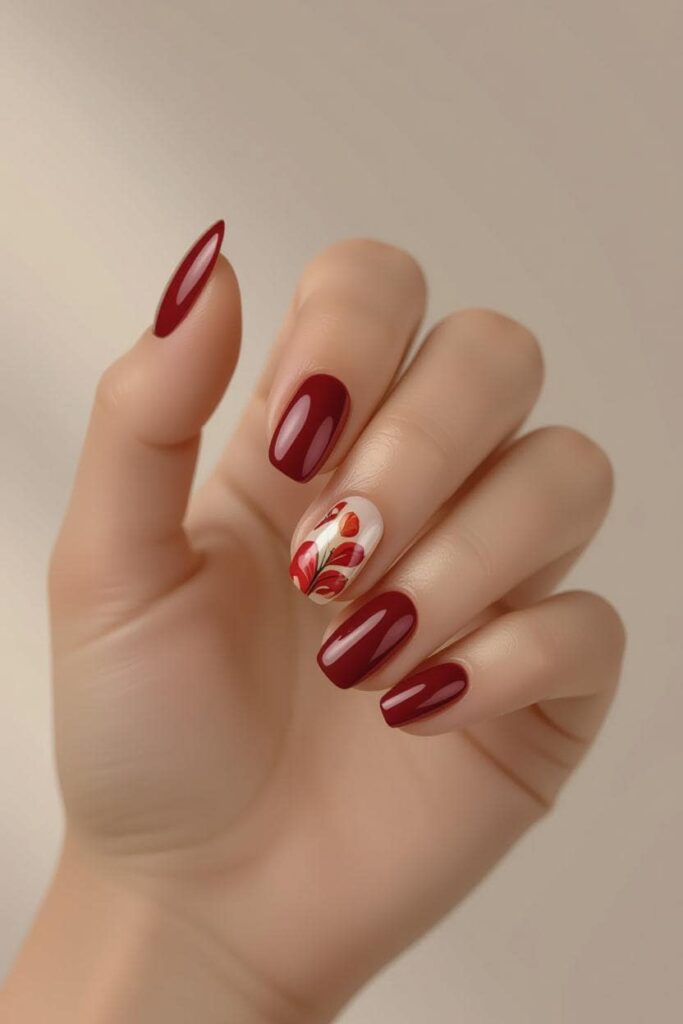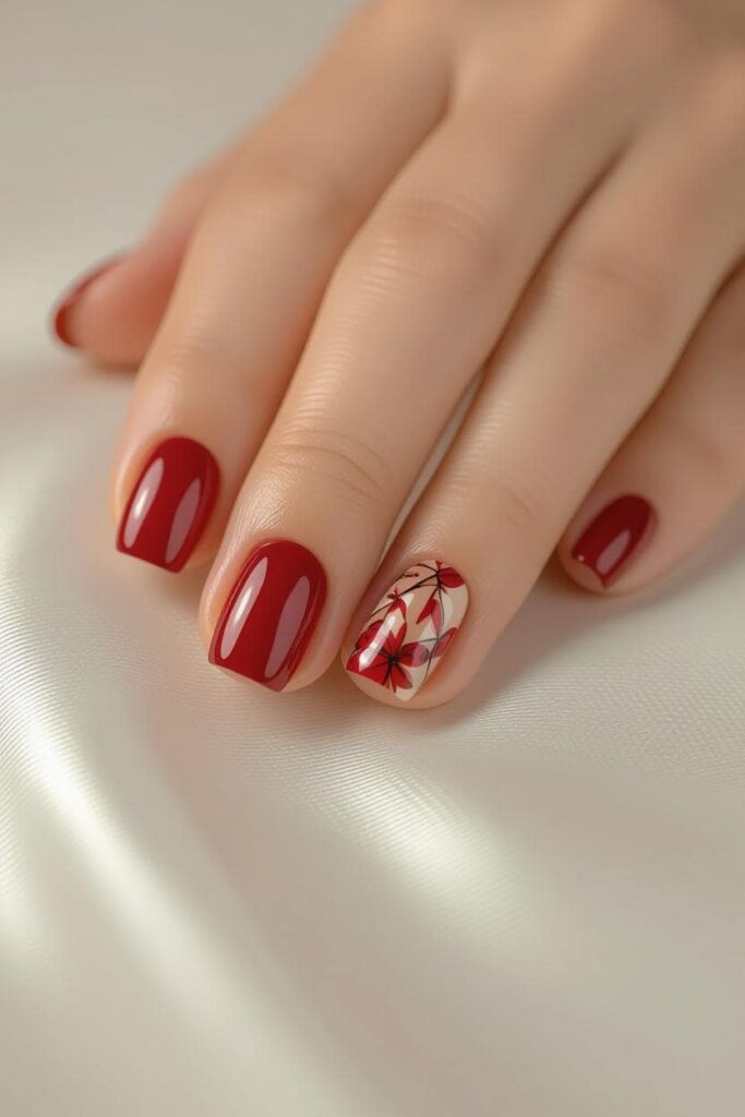 A velvety deep red glossy base frames two accent nails featuring abstract watercolor-style blooms in warm pinks, oranges, and yellows β soft, artistic, and full of autumn romance. The look is bold without being busy, perfect for those who love expressive color with minimal effort.