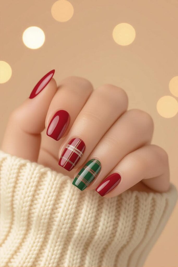 A rich red glossy finish frames two accent nails featuring crisp plaid patterns β one in red-and-white, the other in green-and-white. The look is timeless, holiday-ready, and full of seasonal cheer β perfect for those who love tradition with a modern twist.