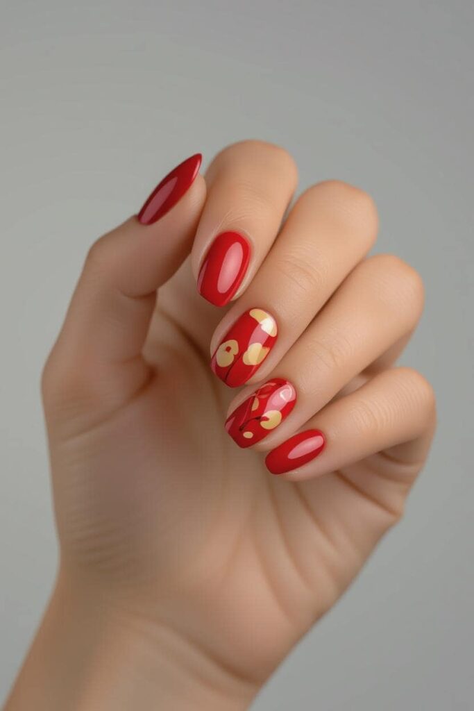 A glossy red base frames two accent nails featuring scattered gold dots β simple, cheerful, and full of autumn sparkle. The look is bold without being busy, perfect for those who love festive fun with minimal effort.