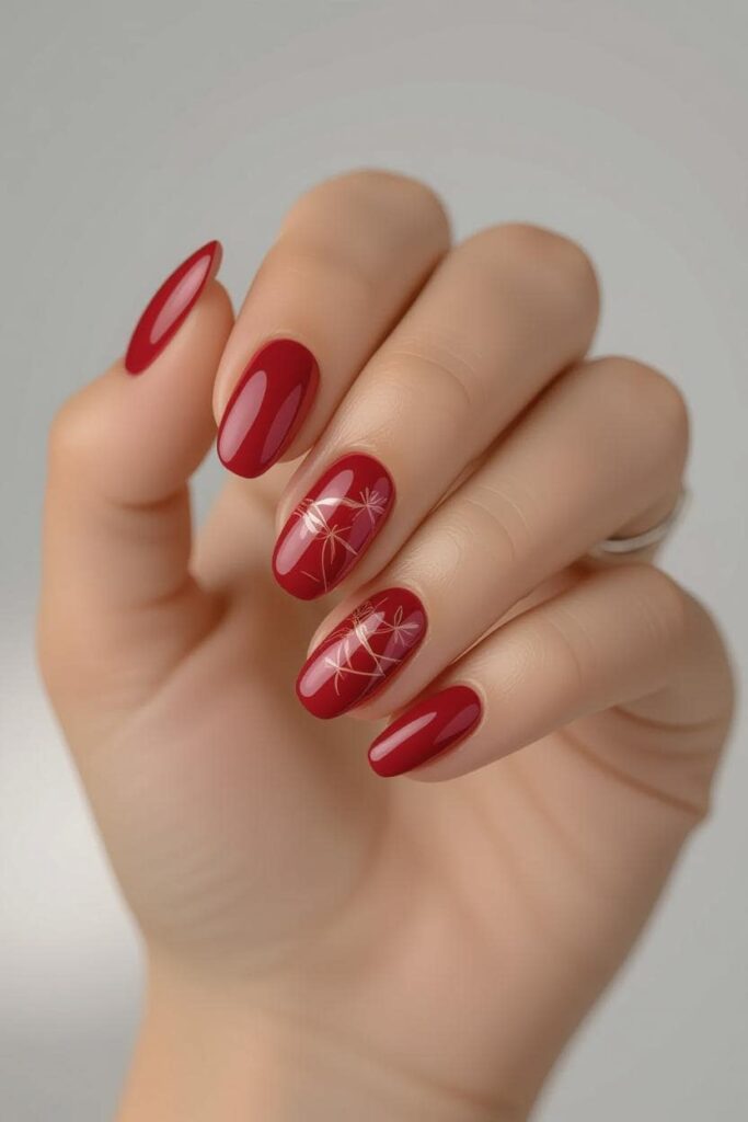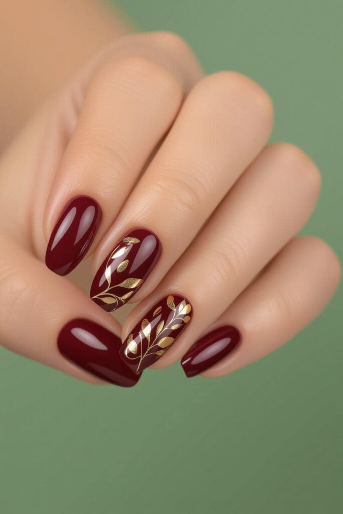 A deep red glossy base frames two accent nails featuring delicate gold leaf patterns β hand-painted with fine brush strokes for a luxurious, metallic touch. The look is warm, sophisticated, and full of autumn luxury β like wearing a gilded wreath on your nails.