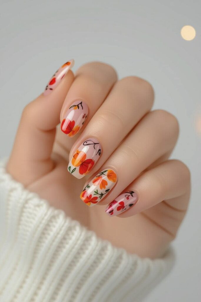 A clean cream glossy base lets every nail shine β featuring playful orange, red, and pink flower blooms with green stems scattered across the surface. The look is cheerful, romantic, and full of seasonal joy β like wearing a garden-inspired sweater on your fingertips.