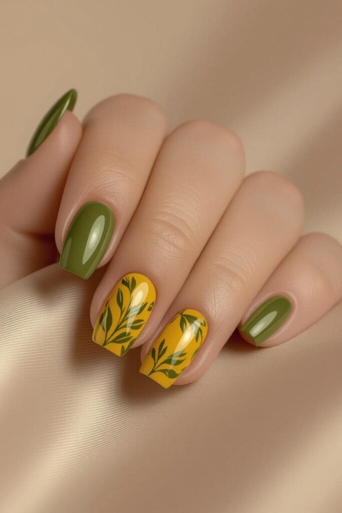 A cheerful mustard yellow base pairs beautifully with two accent nails featuring hand-painted green leaf vines β clean, minimal, and full of autumn energy. The glossy finish adds depth without complexity, making this look perfect for those who want bold color without fuss.