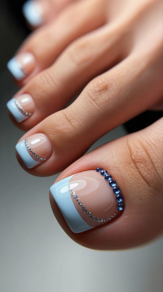 Soft ice blue tips meet nude bases, but here’s the twist: one toe features a delicate crescent of rhinestones and sapphire gems — like a frozen moonbeam caught on your foot. The glossy finish catches every glint of light, making it perfect for evening events or elegant winter weddings.