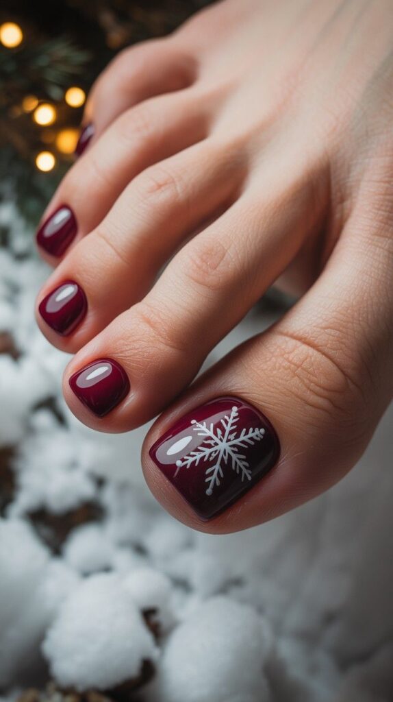 Rich burgundy polish gleams with high-gloss shine, while one toe features a bold white snowflake — like a winter night captured in miniature. The crisp contrast makes it pop without overpowering your look, perfect for cozy nights in or festive gatherings. Paired with snowy ground and twinkling lights, this design whispers ‘luxury magic’ with every step.